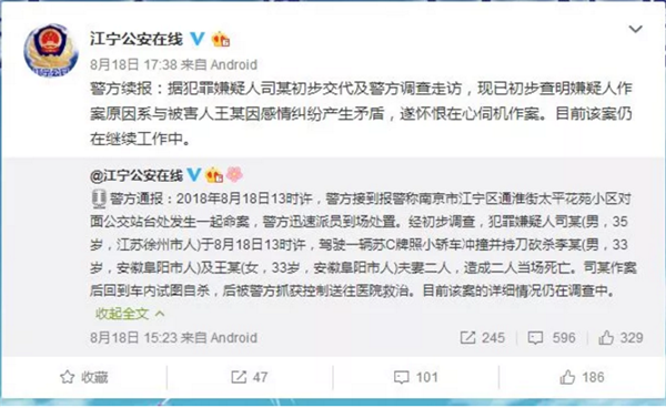 昨天下午,新浪微博@江宁公安在线 发布警方通报: